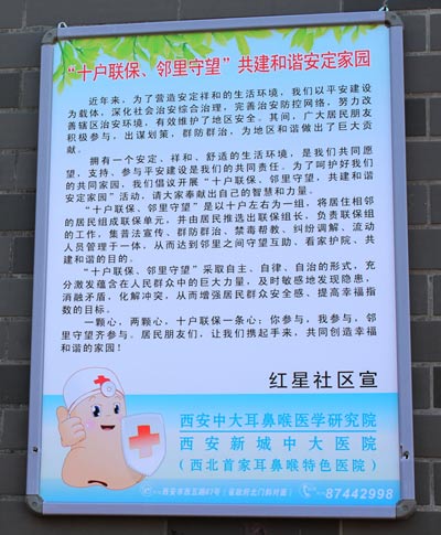 一直以来西安中大耳鼻喉医院开展了多次在社区义诊社区服务,提高社区耳鼻喉知识等公益活动。这次西安中大耳鼻喉医院将公益提升到另一个高度,不但在居民的医疗服务上且将公益扩大化,提升到居民社区安全及提升居民幸福指数。在红星社区墙体以及多个社区街道宣传“十里联保邻里相望”,共建合谐安定家园。