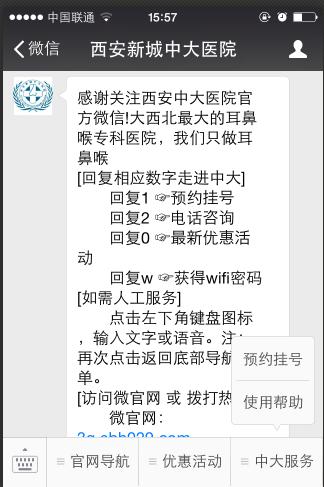 据悉,西安中大耳鼻喉医院是西安市首家与腾讯微信合作的医院,同时也是西安市首个开通微信支付的医院。截至目前,微信智慧医疗解决方案已经覆盖的地区包括北京、上海、广东、江苏、浙江、湖南、湖北、四川、重庆、云南、海南等地,近100家医院上线微信全流程就诊,超过1200家医院支持微信挂号,服务累计患者超过300万。