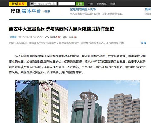 当前位置: 首页 > 新闻中心 > 【搜狐网】西安中大耳鼻喉医院与陕西省医院结成协作单位